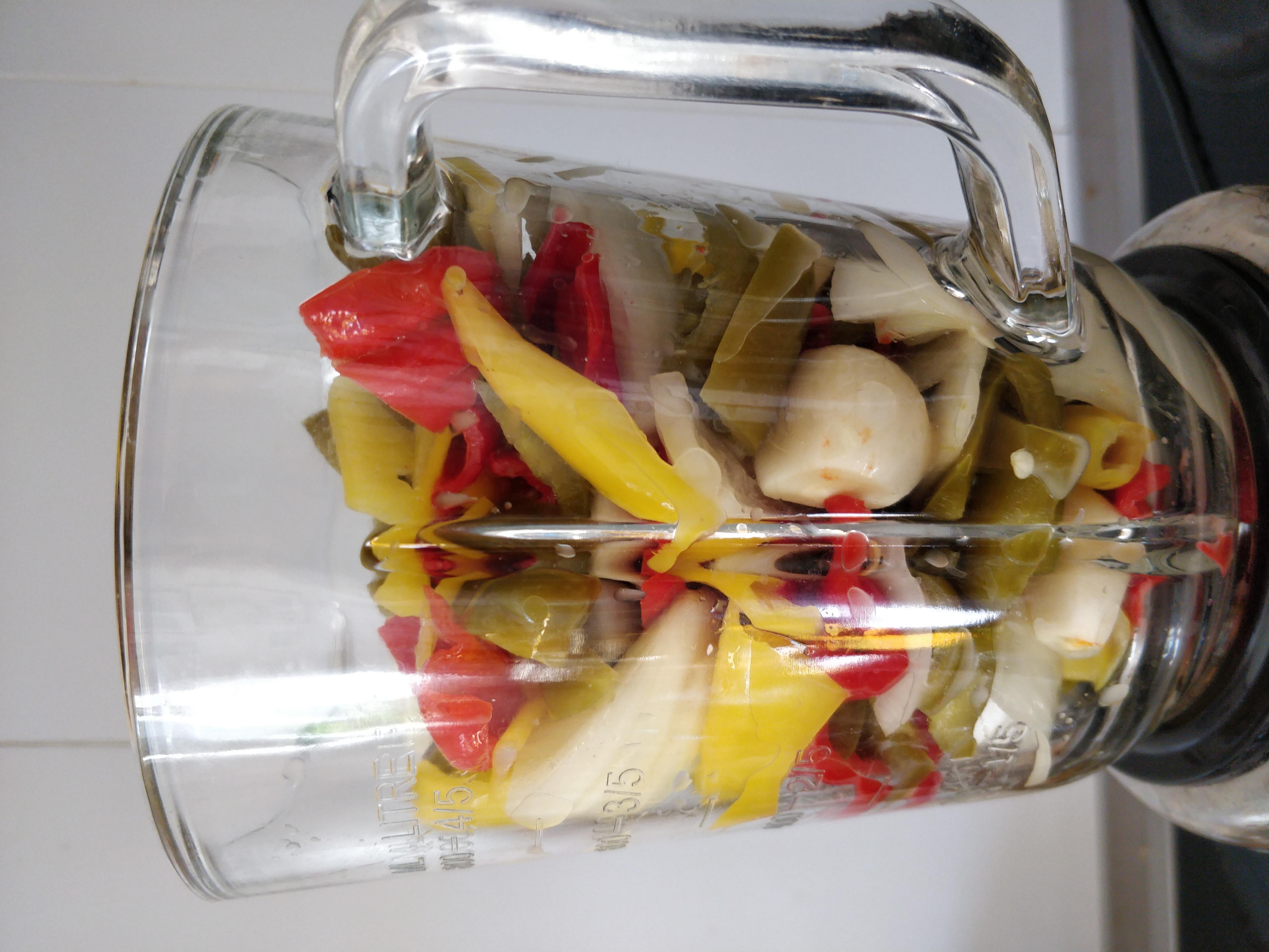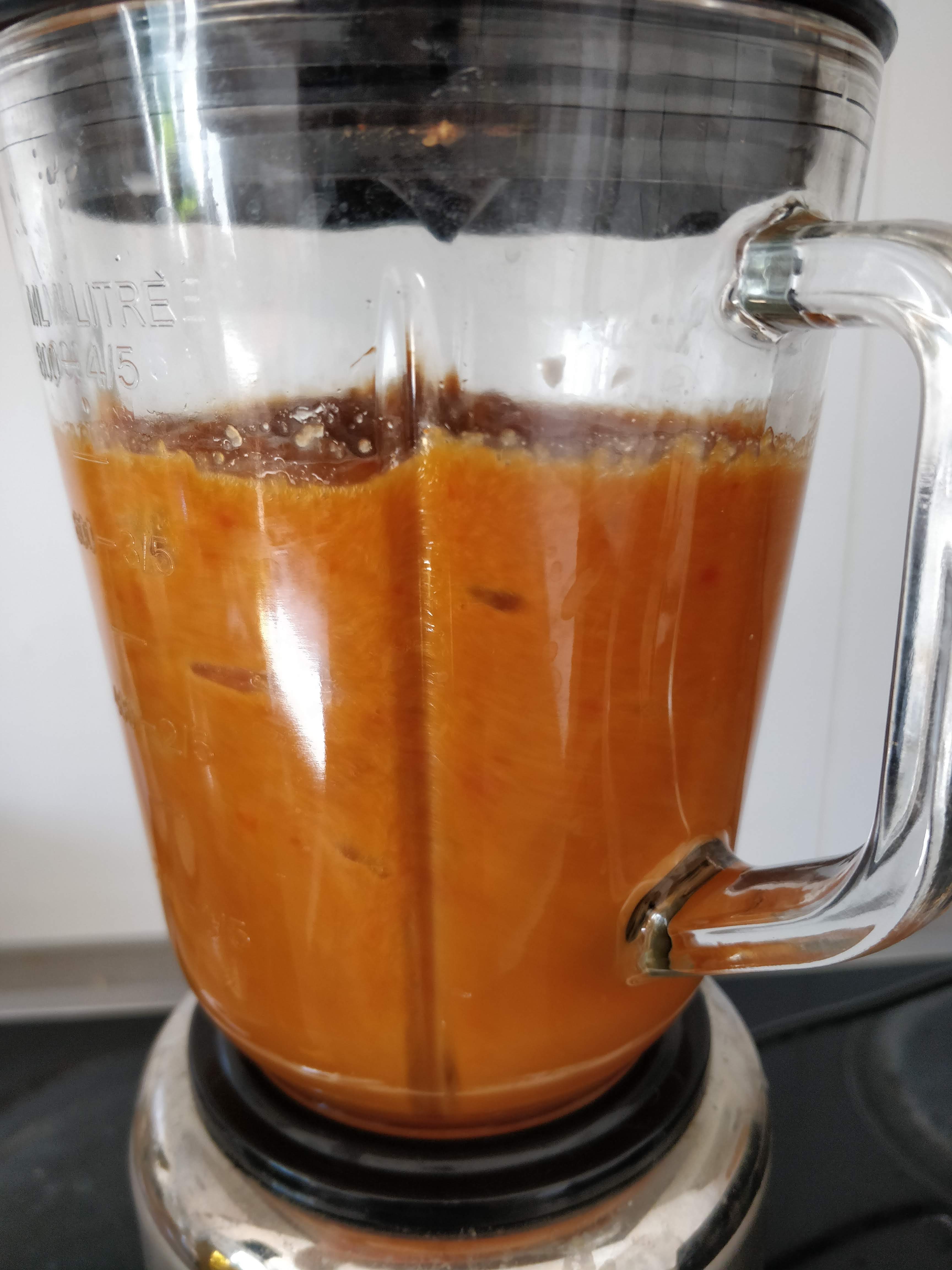 Blend half of the fermented chilies in a blender with 60 mL of apple cider vinegar, 60 mL of water and all of the previously fermented peaches (UFO_peaches) that were stored in the fridge for a few weeks (drain away brine before adding).