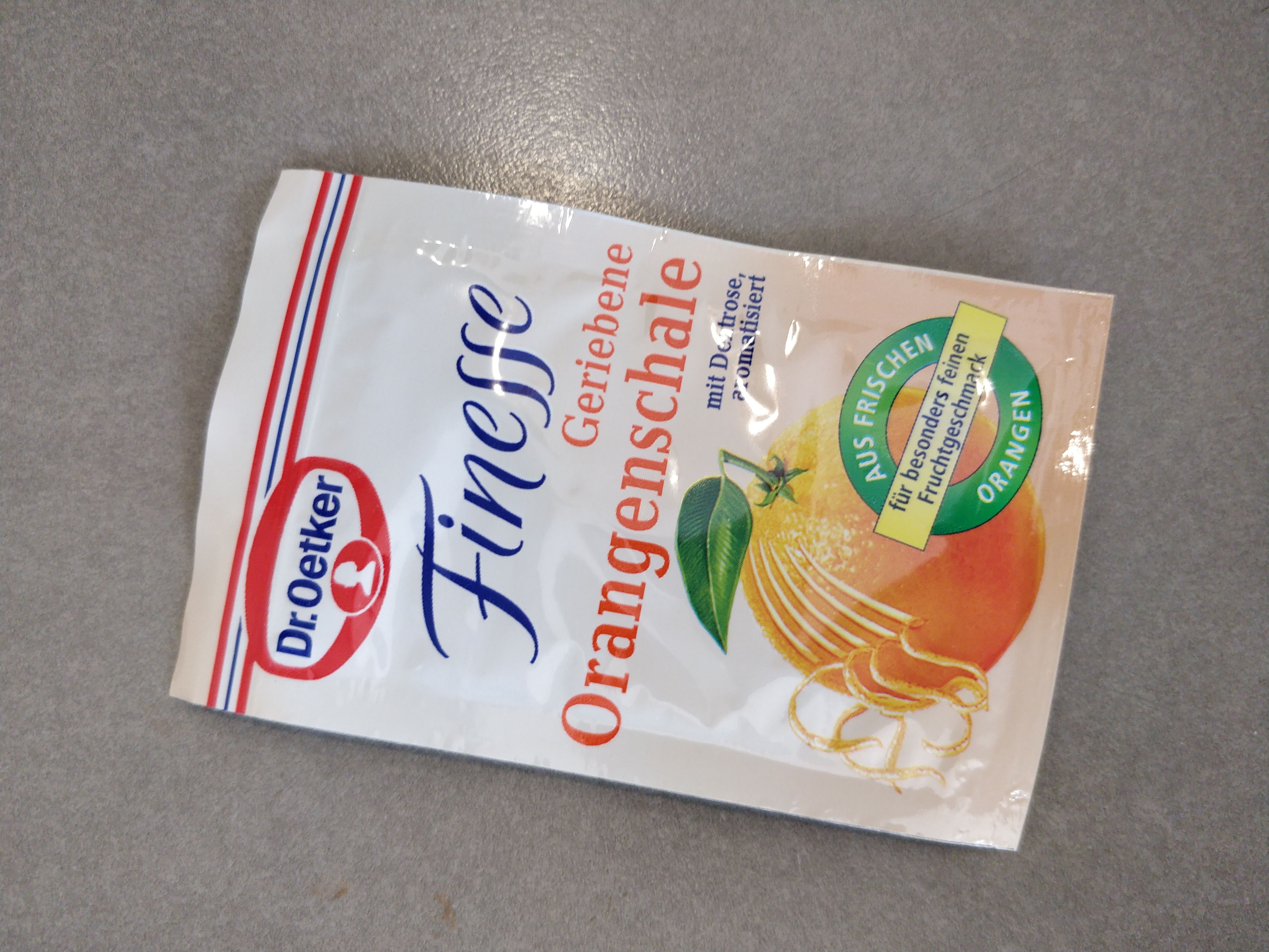 Blend half of the fermented chilies in a blender with 30 mL of apple cider vinegar. Add a few good pinches of salt. Add one package of Dr. Oetker orange zest for baking: