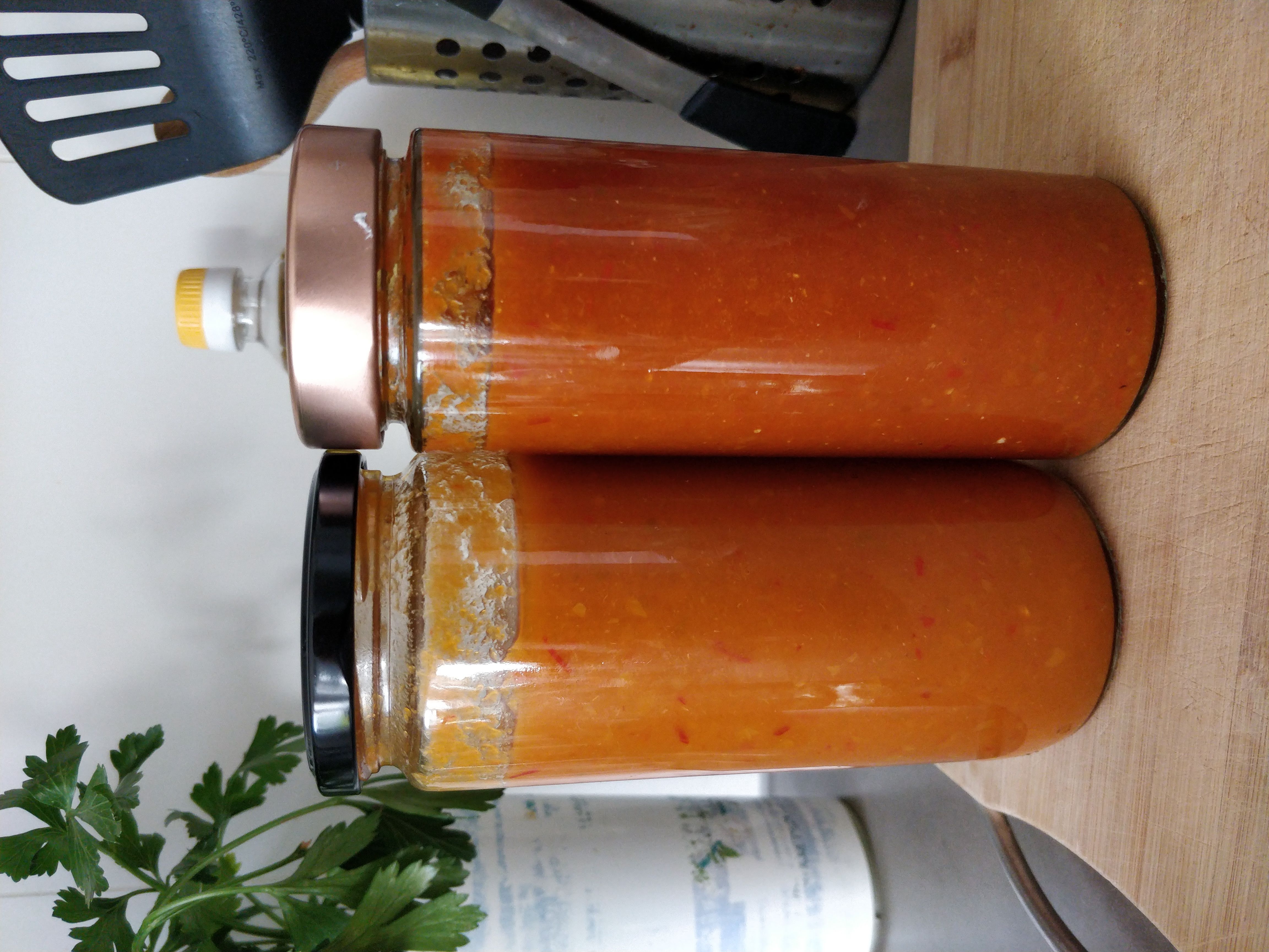 Plan: Make a simple chili sauce base, ferment, then mix together with the fermented peaches (UFO_peaches) to get a nice, fruity condiment.