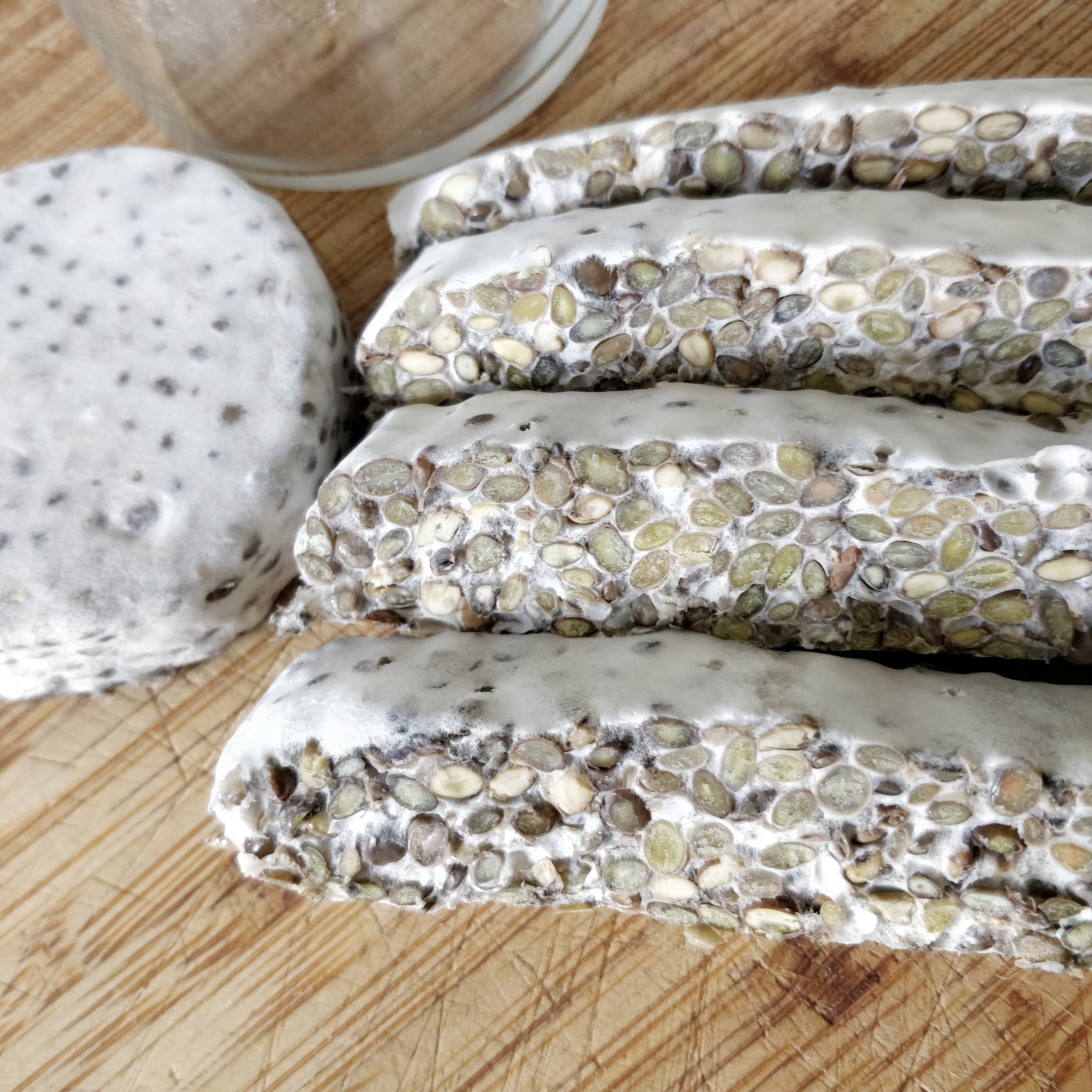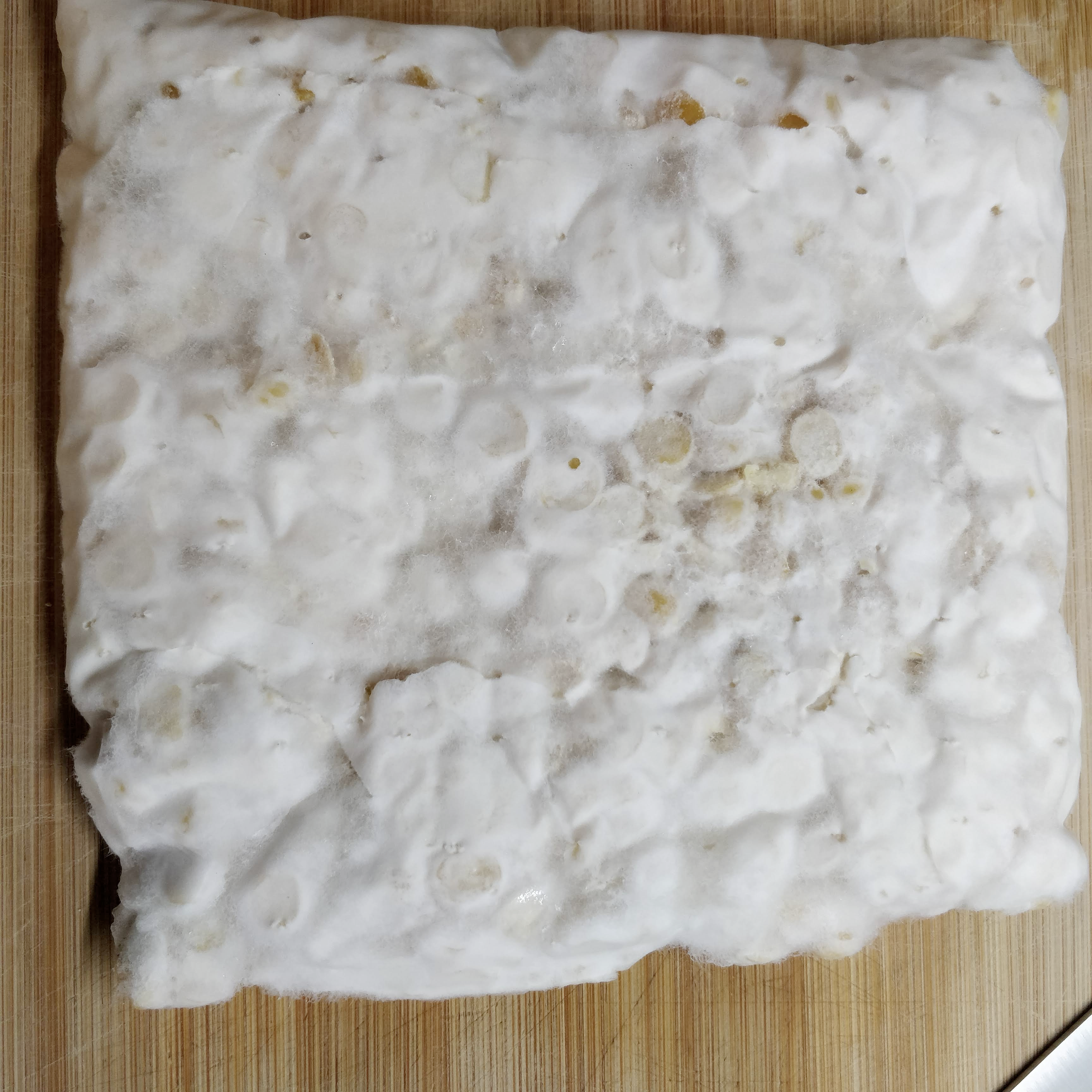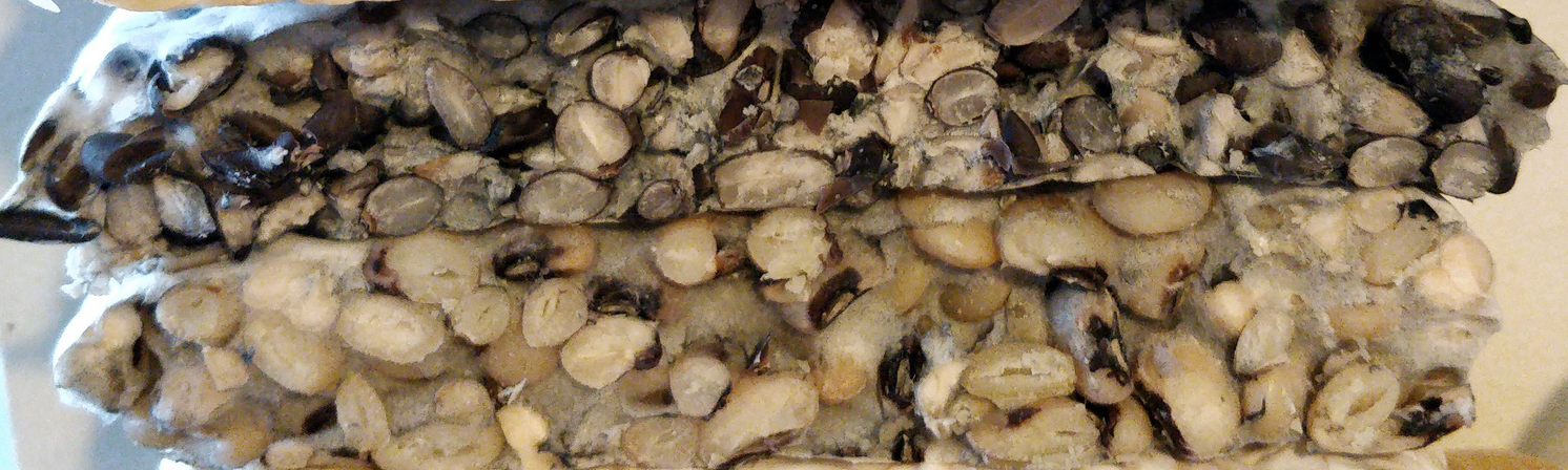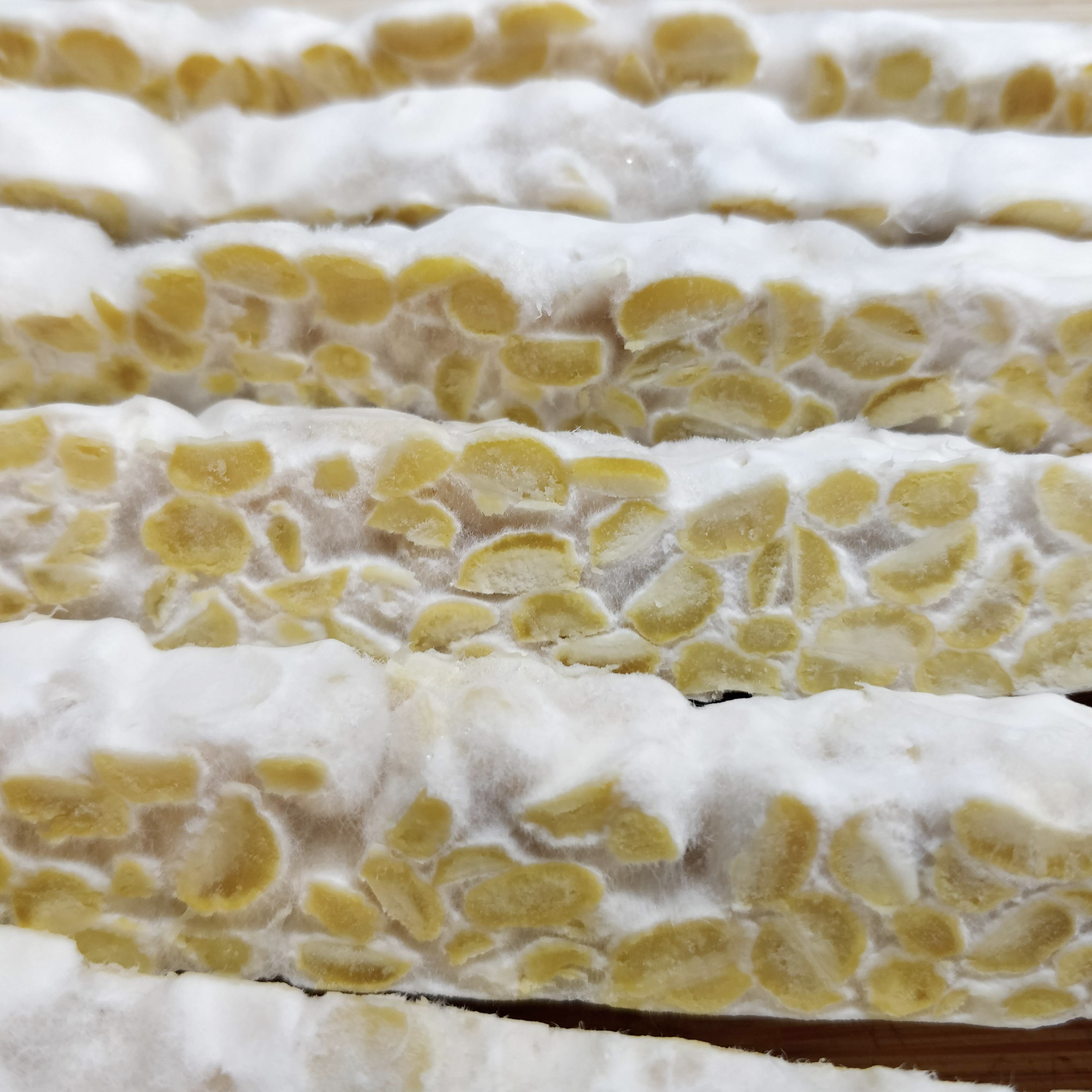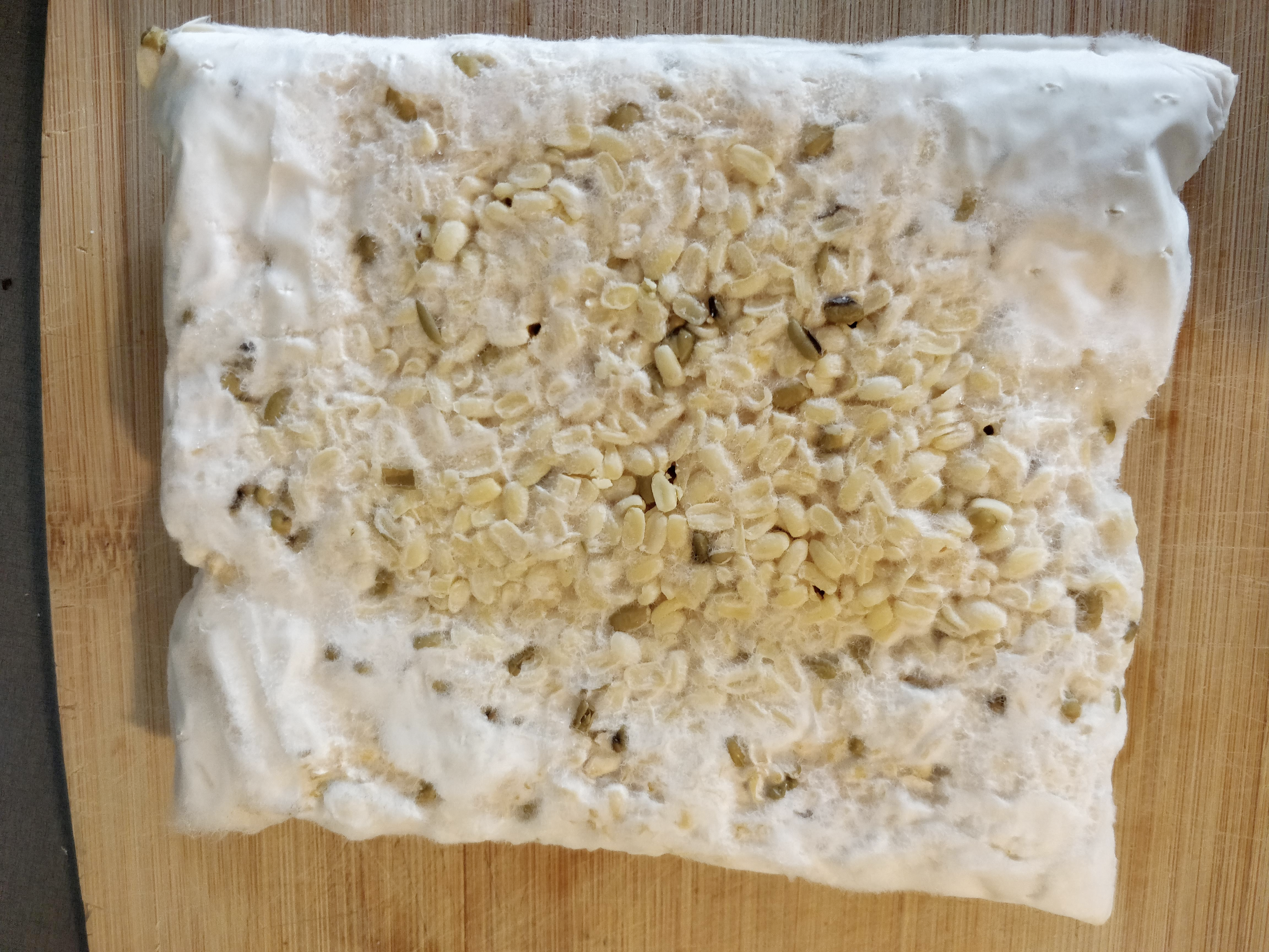 —> dry the beans better next time and cook less!Cut structure is not bad, but there are wet beans visible that turned brown and funky. Throw away. Open: Irregular surface of beans with some fluffy mycelium growing up, some sporulation. When cut quite crumbly, because beans are quite big. Spores are also inside, probably because of air pockets—> press better together and maybe cover with something. Also chop a bit smaller next time.Smell of open sample not unpleasant, so the smell comes really from the exposed beans-on-wet-plastic in the plastic bag sample.
