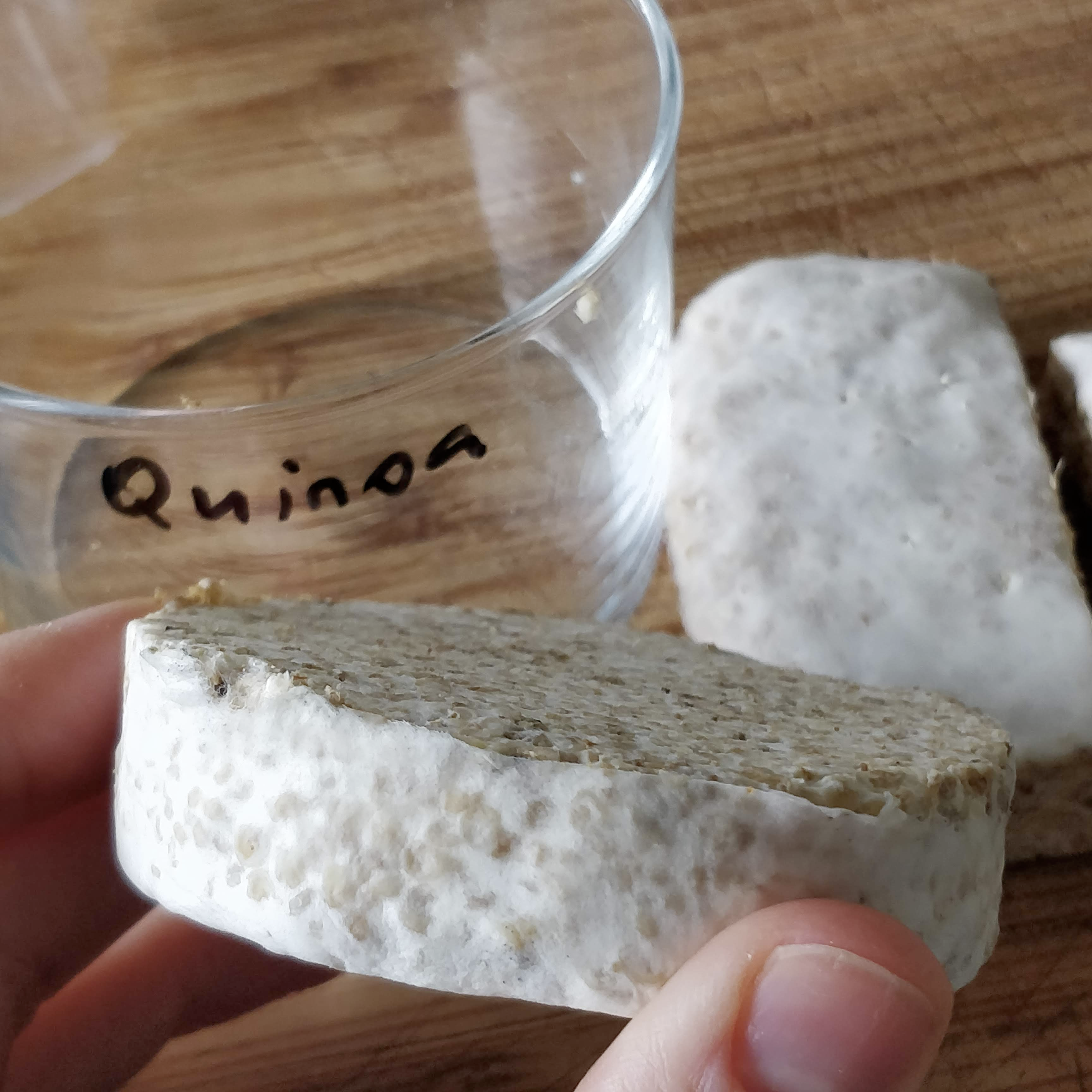 —> Dry the grains more and mix with something bigger to avoid too dense cake.The nice parts have a slighly animal and rotten smell, not entirely pleasant. Nice dense cake in most parts, but e.g. the corners of the plastic bag are not as dense and a bit wet and smell more sharp (ethanol, ammonia). Open: Nice, dense cake, but a lot of fluffy, sporulating mycelium on top—> incubate for a shorter time!Smell of open is less unpleasant and more mushroomy than the plastic bag—> Maybe quinoa needs a LOT of air.