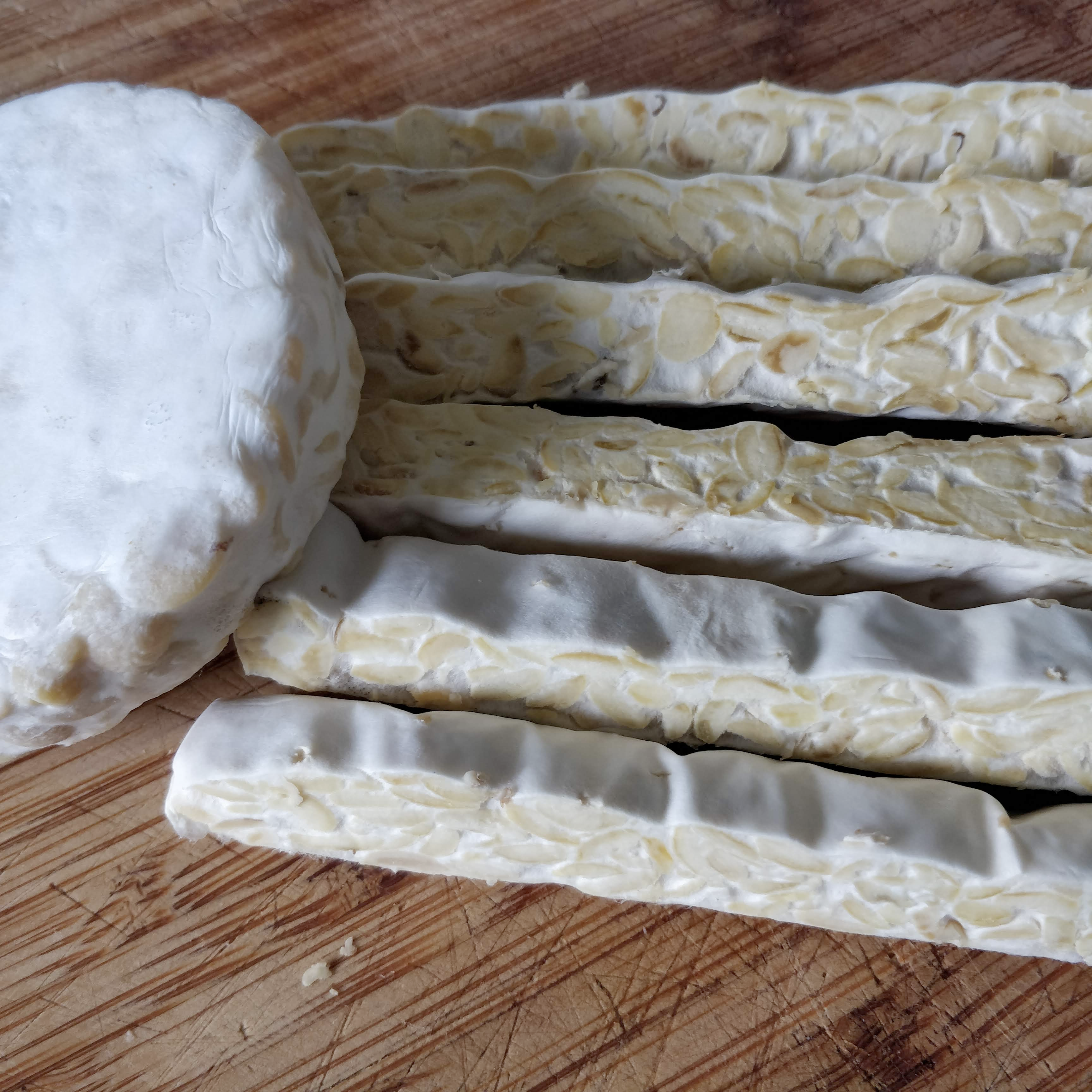 Split into 4 pieces, let thaw (if frozen). No visual difference between frozen and heat-treated tempeh (other than that the not heat-treated one is slightly whiter). Slight difference in smell: frozen & thawed has fresh mushroomy smell, the heat-treated one smells mild and slightly stale.