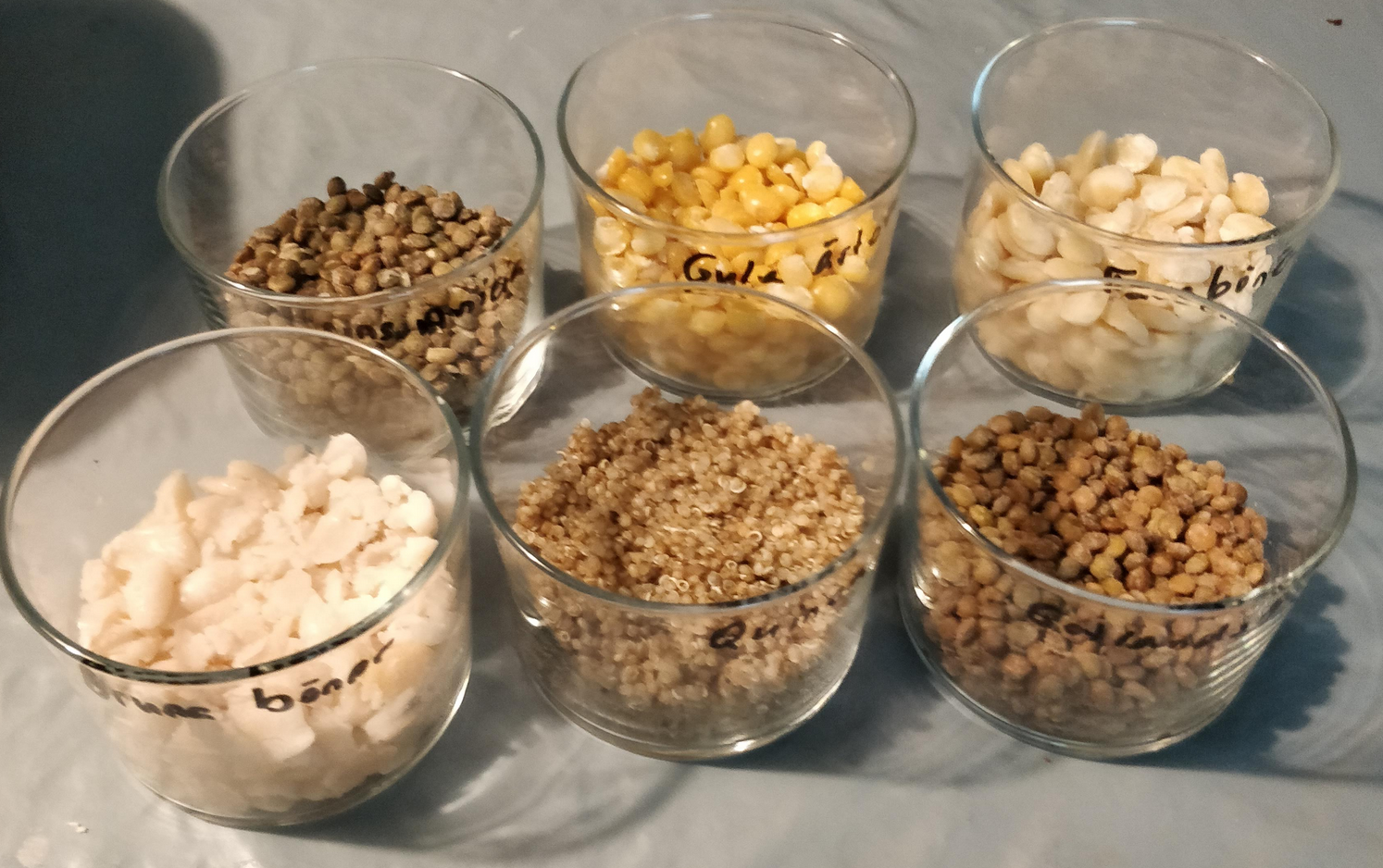 - Material: Legumes from FRAM, Gothenburg. 125 g dry legumes/grains each.