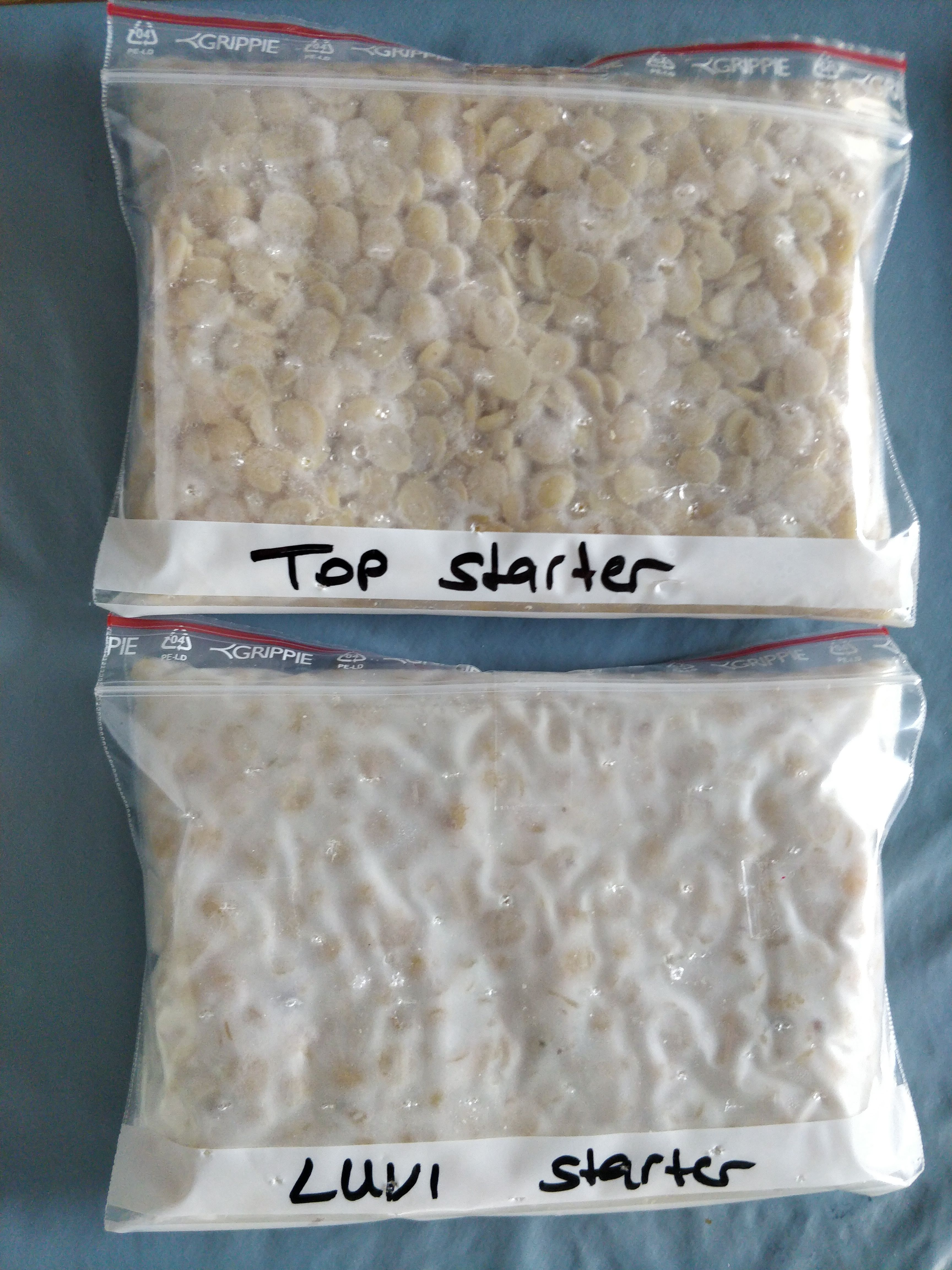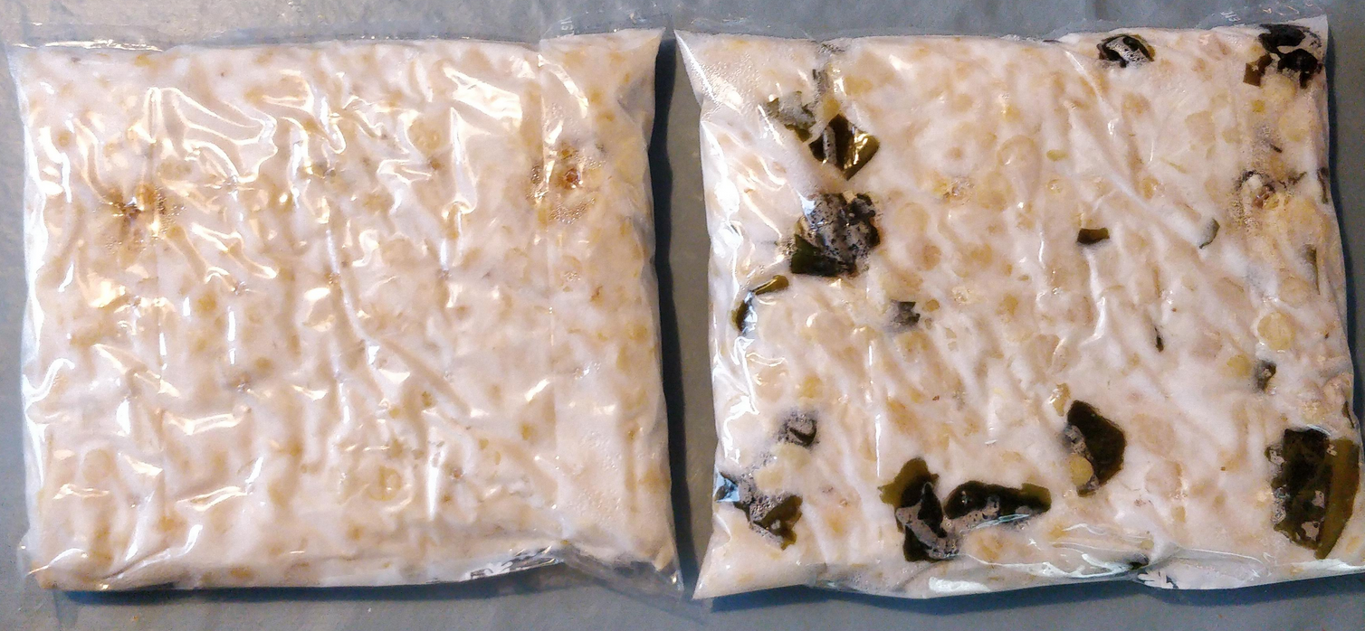Gotland lentils: Open: Very fluffy on the top and a tiny bit sporulation. Black colour is visible underneath, but that’s from the lentils, not spores. Plastic: Quite dense block, no wet or empty bits. Nice to cut and looks very pretty, but the lentils start falling out of the block a bit. When boiled, quite many lentils fall out, leaving small holes in the block. Not holding together as well as e.g. brown beans. Quite brittle after boiling