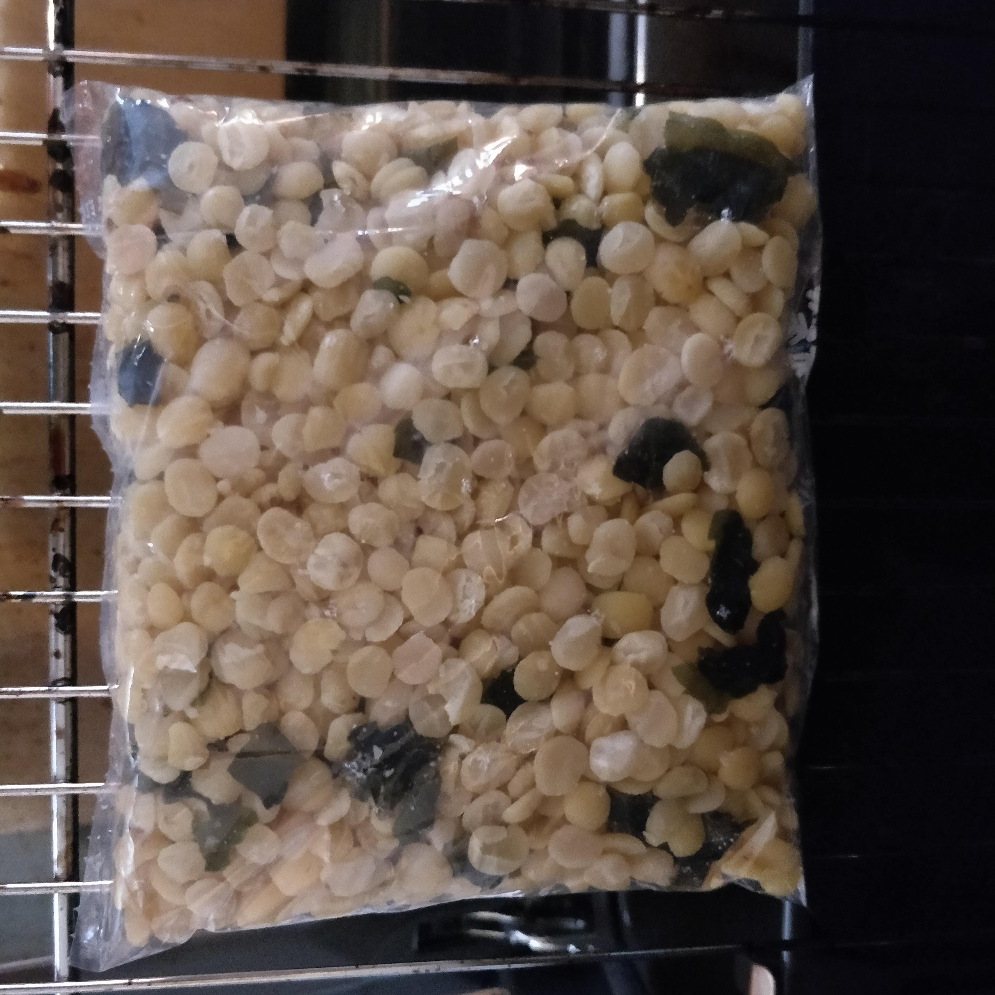 Mix toor dal with half of black beans (cooked weight: 225g). Mix favabeans with half of black beans (cooked weight: 225g). Then fill in bags (new bags ordered from Fyndiq: Zip bag 16x12cm, PE-LD): 300g are a good amount to completely fill the bag and get a nice thick cake. Total: 4x300g and a small bag with the rest of all beans mixed (150g) (i.e. 750g dry beans made 1350g wet beans/tempeh).
