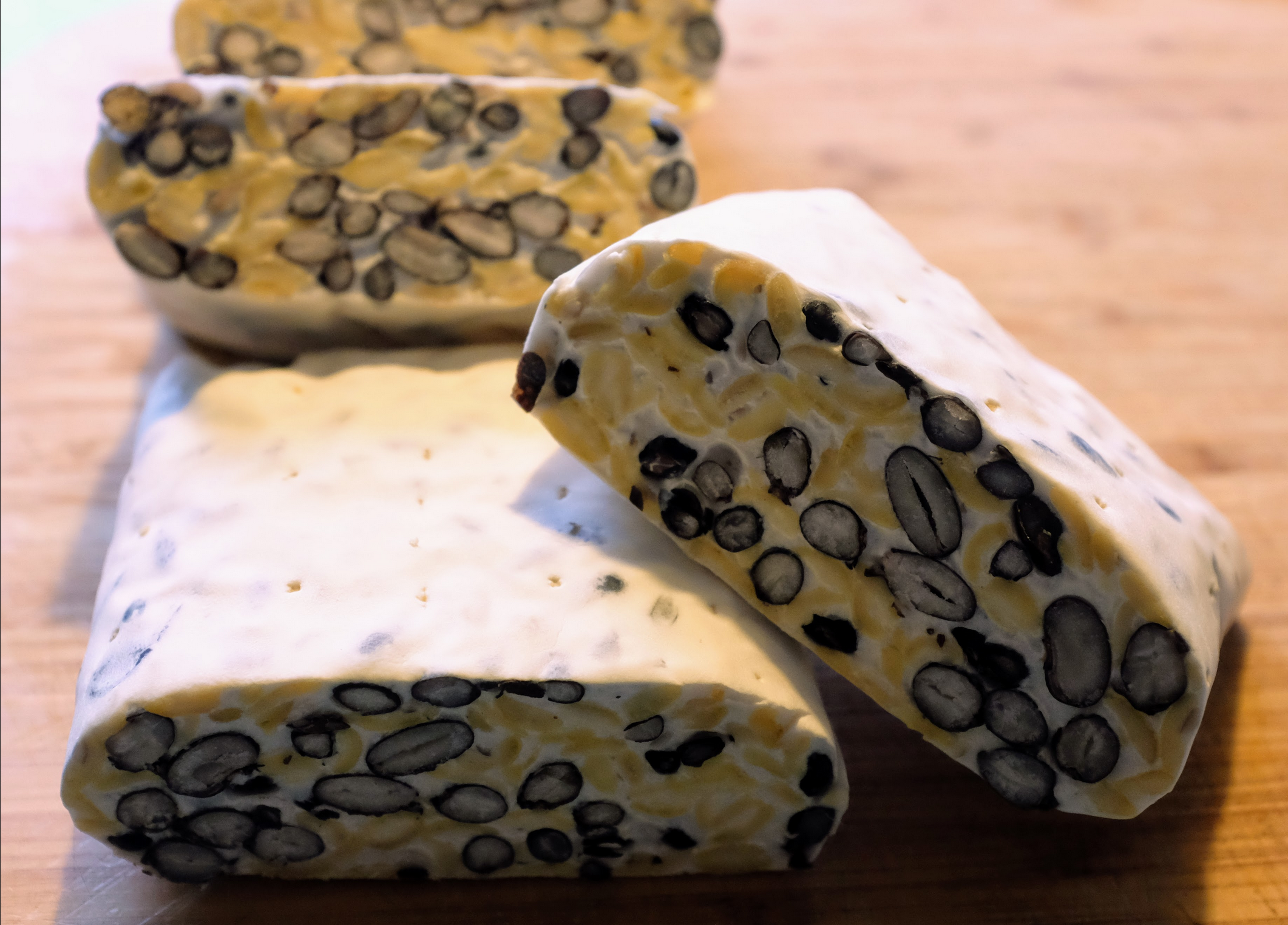 Next time: Increase soy bean ratio to have the block hold together better. The moth beans have quite a tough outside and make the tempeh texture a bit looser.