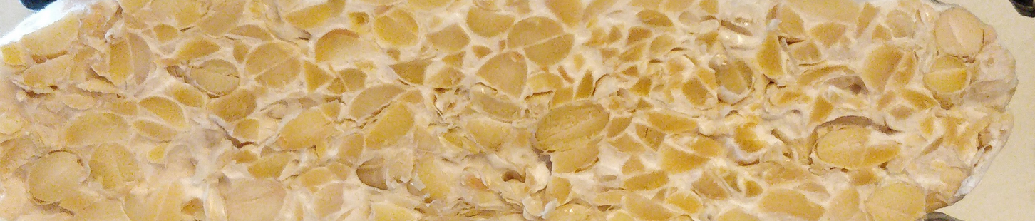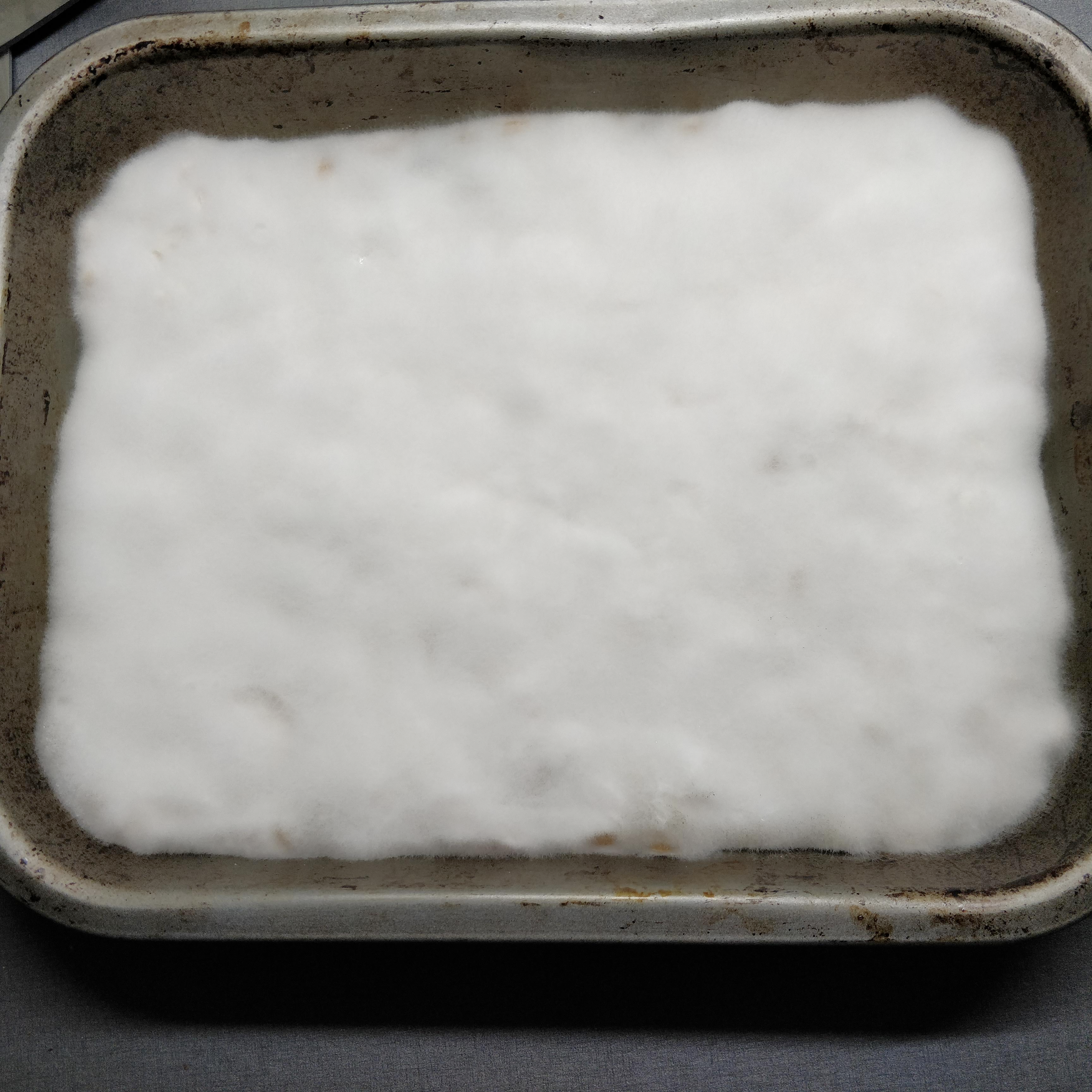 To try to dehull - though it mostly chopped the beans rather than dehulling. Rinse and boil for 30 min. Drain, add 1 Tbsp vinegar (4 Tbsp/kg), let dry in oven at 50-70°C (for 2h). Mix in 1 tsp LUVI starter (2 tsp/kg), fill in bag and incubate in oven on heating mat set to 30°C. Fermented quite quickly and got warm (up to 33C), so I took it out to cool, and then even put on the balcony over night. Continued to let ferment a bit inside at room temperature to get nice dense cake. Slight dark sporulation visible in some spots.