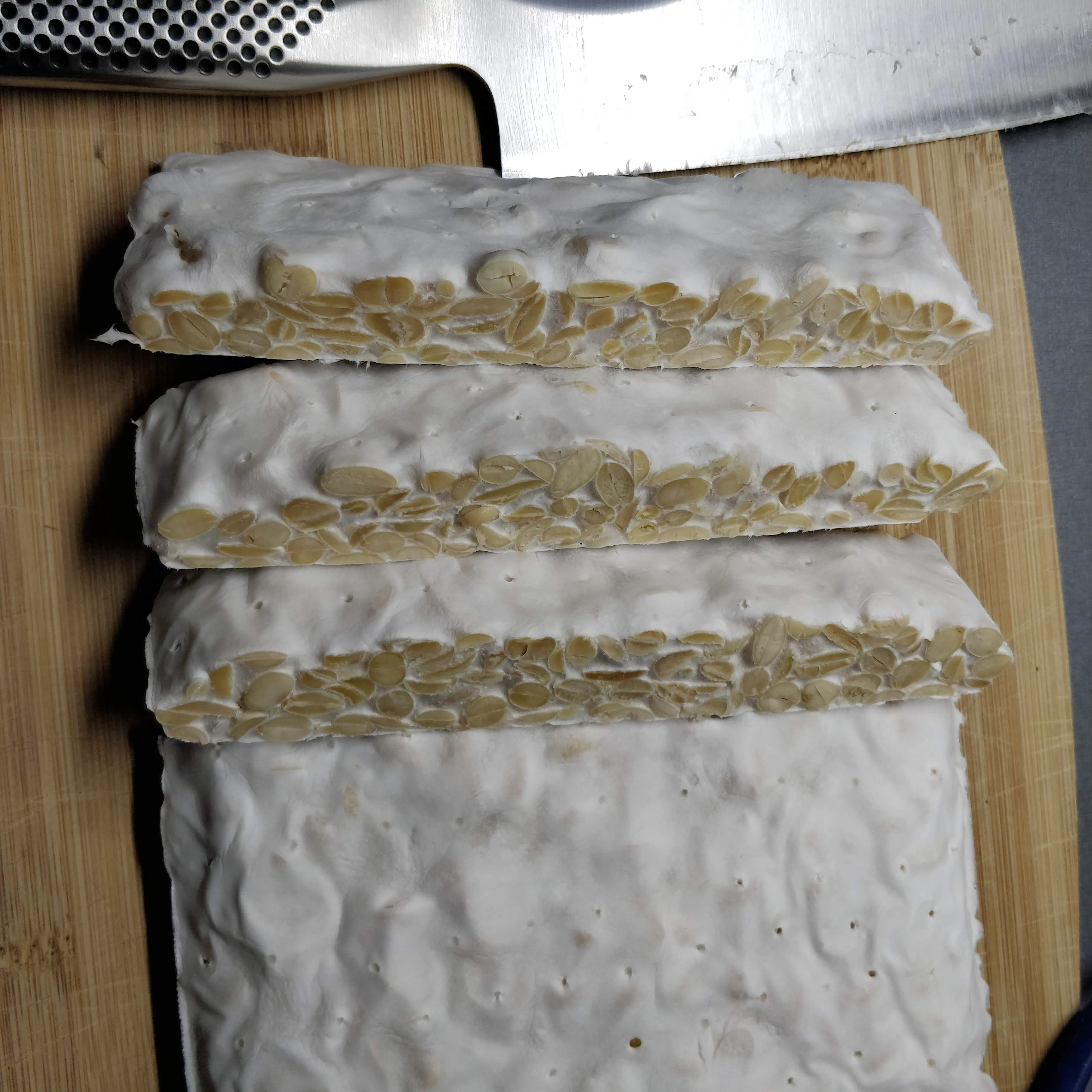 Chop in food processor until most beans have been chopped, 4-5 pulses (although that results in many very small pieces and some that are still intact beans). Rinse and boil for 20 min. Drain, add 1 Tbsp vinegar (4 Tbsp/kg), let dry in oven at 40°C (takes foreeever to dry). Mix in 1/2 tsp LUVI starter (2 tsp/kg), fill in bag and incubate in oven at 30°C (start: 21:00). Take out of oven 20h later. Leave it outside on the countertop for another 5 hours. Total incubation: 22h. Very nicely firm cake, very good mycelium growth, looks clean and very appealing.