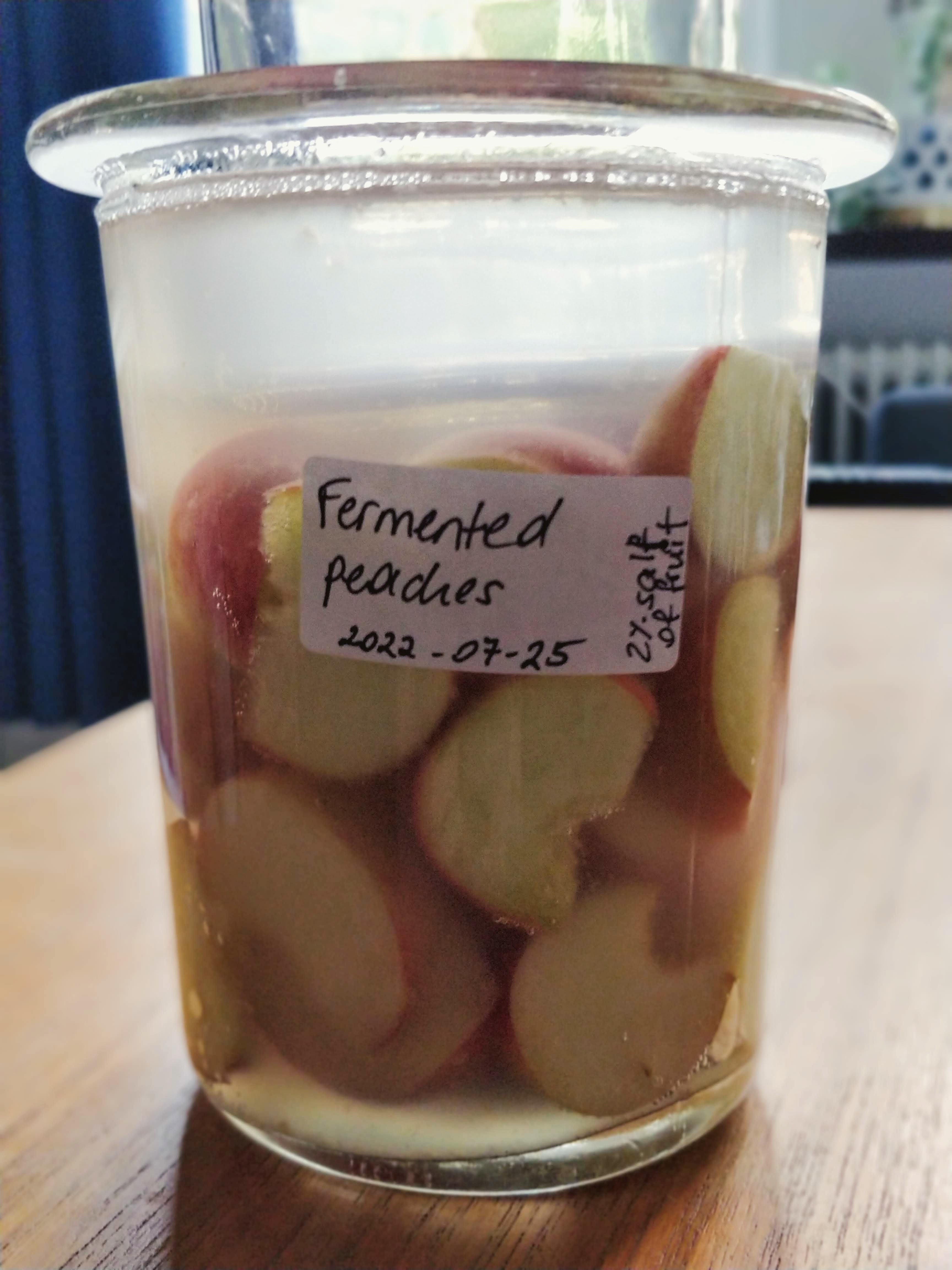 After 1-2 weeks in the fridge, the peaches have softened even more and disintegrated a bit, but also acidity has increased. They don’t taste salty any more, but more fizzy, fruity and sour. quite a lot of kahm yeast growth on the top during fridge storage, but no bad smell or taste.