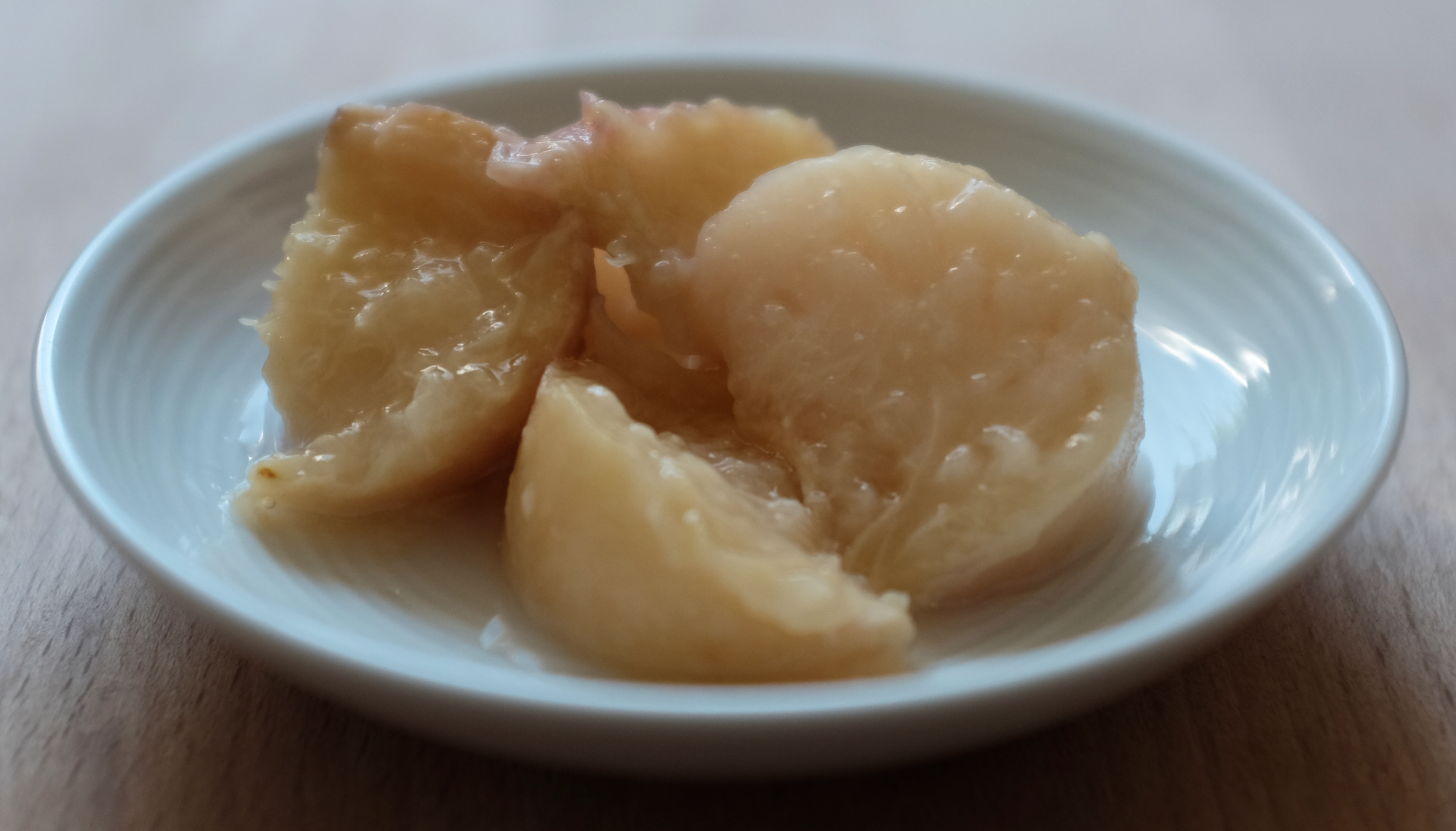 Bought “UFO peaches” from Hemköp (grown in Spain), 29.90 SEK for 500 g. Washed and cut each into 8 chunks.