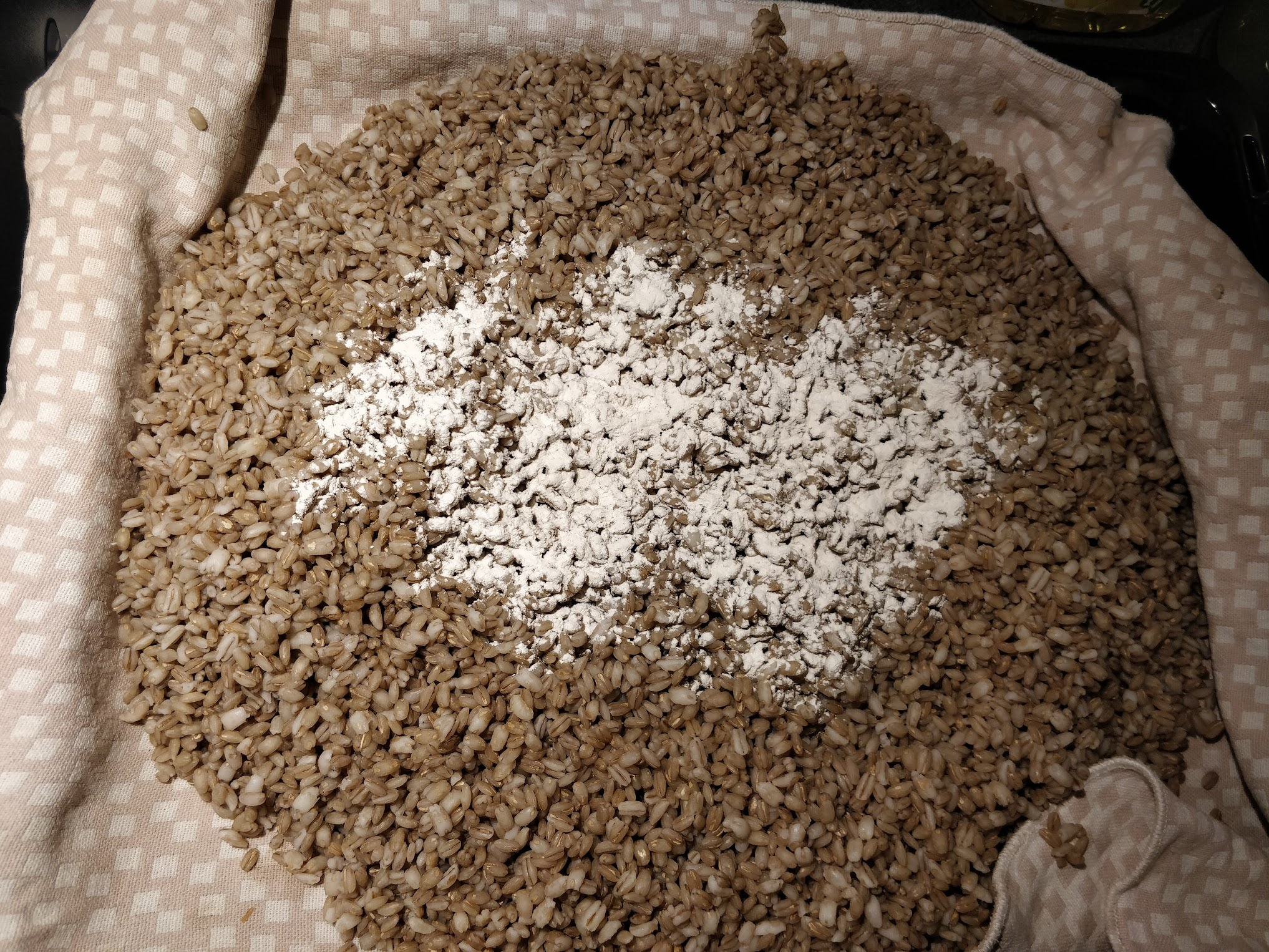 When grains have steamed off and cooled down <40C, sprinkle 20 g of koji spore flour (see above) onto it in several steps, mixing well in between to incorporate the spore flour evenly. (20 g because I don’t know for sure how heavy the cooked barley is, but 1.2 g dry barley probably results in something like 1.8 kg of wet barley).