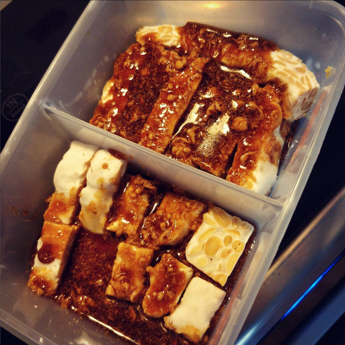 Mix marinade: 2 Tbsp water, 2 Tbsp syrup, 1 Tbsp soy sauce, 1 tsp (heap) nutritional yeast, 1 tsp ketchup, 1 tsp oil, 1/4 tsp liquid smoke, pinch paprika, pinch cumin, pinch black pepper.