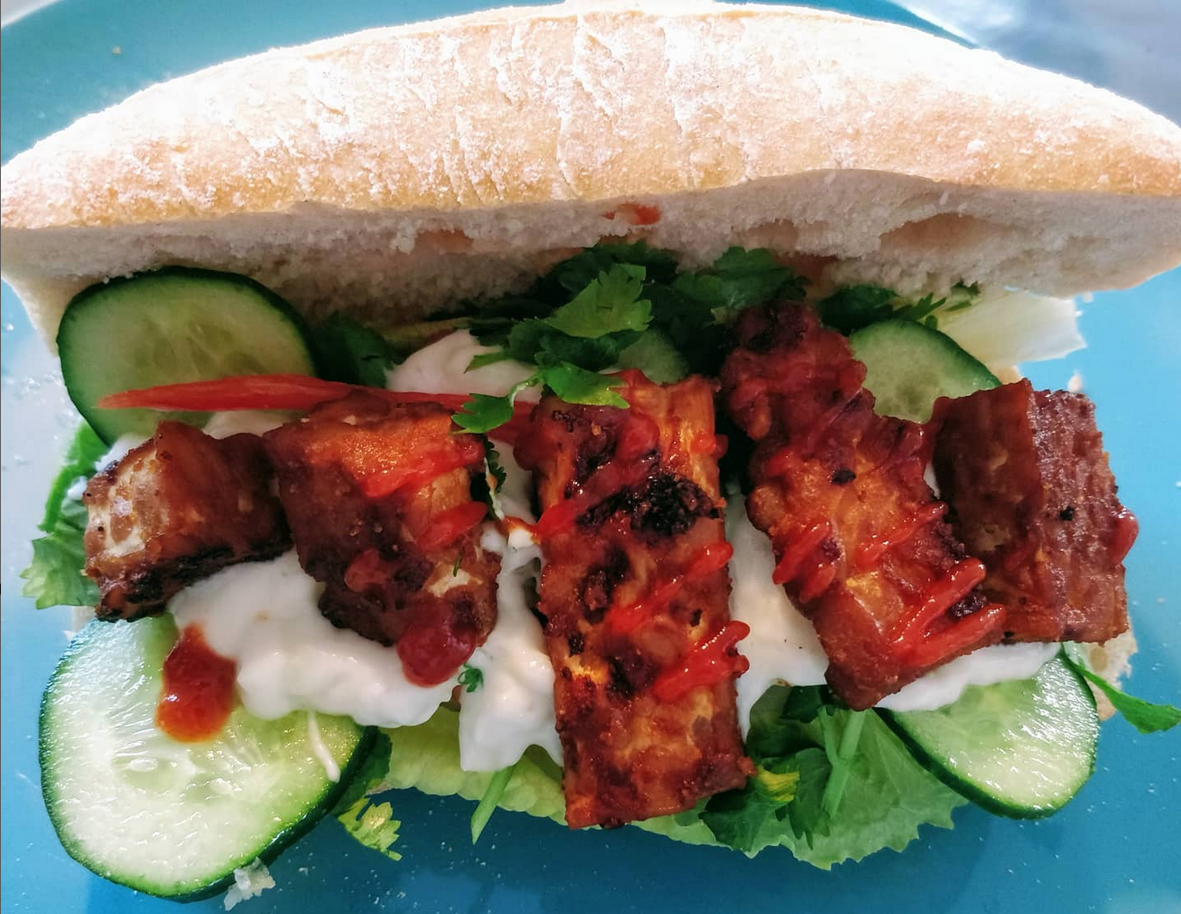 Fry the marinated tempeh pieces. Layer into the baguette: mayonnaise, vegetables, tempeh, Sriracha, coriander. YUM!