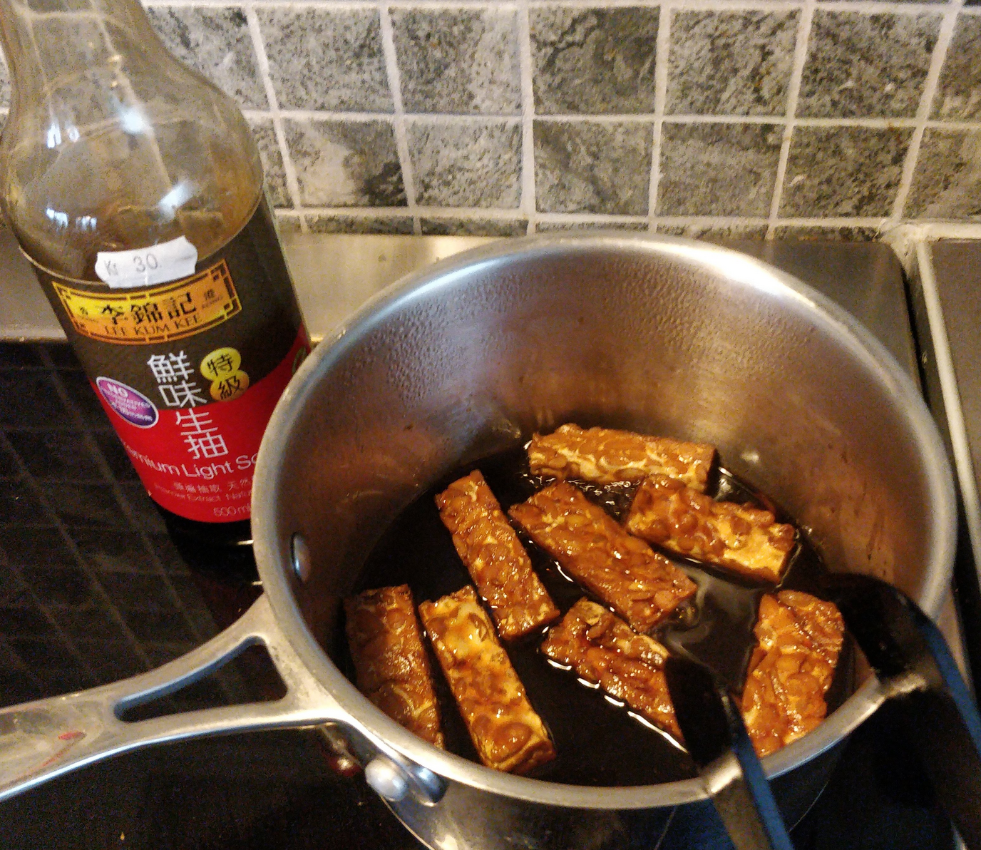 Instead of marinating, simmering in a mix of water, soy sauce and/or tamari infuses the tempeh with some flavour and saltiness, while also reducing bitterness. It also makes the tempeh a bit chewier (sometimes more meat-like), but also softens the tempeh. Be very gentle when the structure is loose (like with hard-skinned lentils).