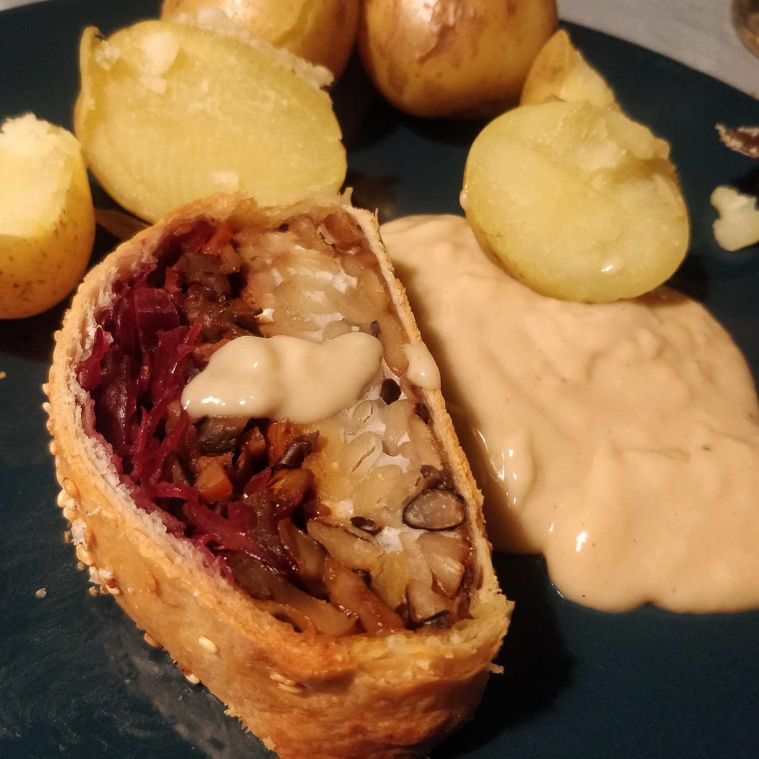 - Lay marinated tempeh blcok on one end of the pastry sheet, leaving 2 cm clear around the edges.