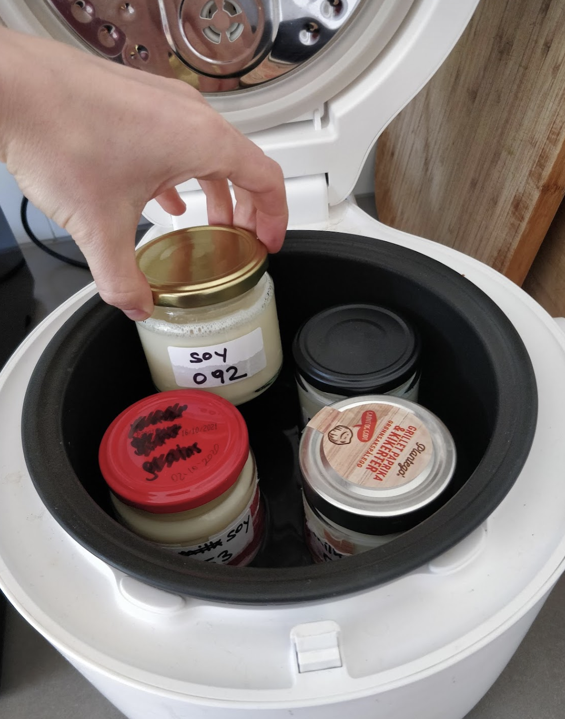 2025-08-17 Try plain soy milk (ICA brand) without scalding. Just pour cold into little buckets, add starter culture, run with yogurt program in rice cooker 40C, 6.5h).