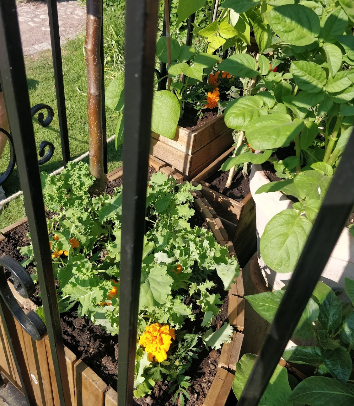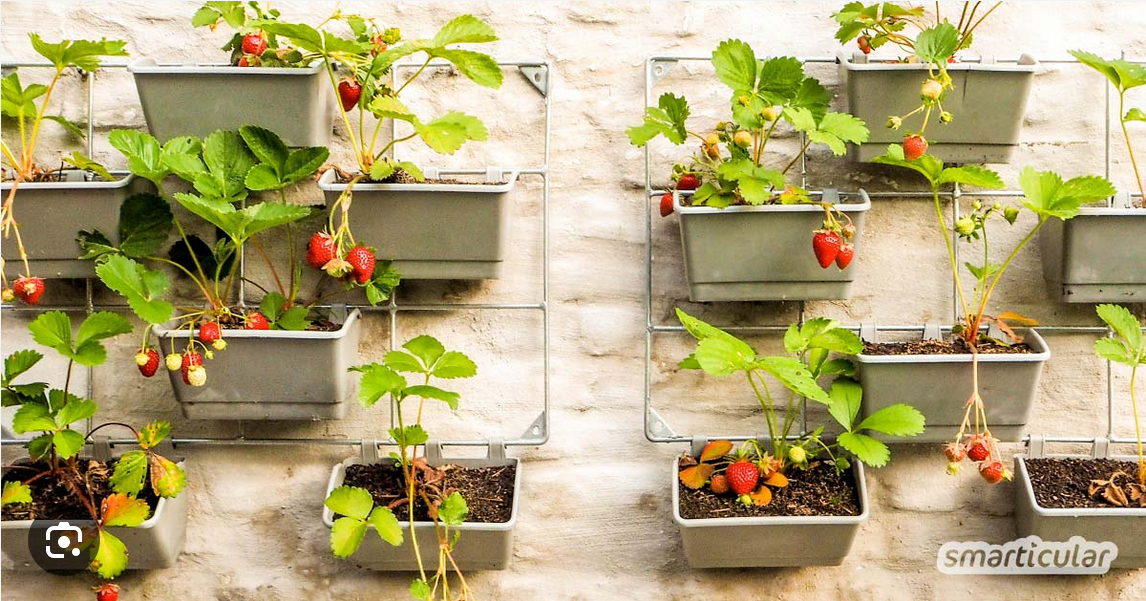 Double-level pallgkrage with snack peppers, herbs, strawberries and flowers.