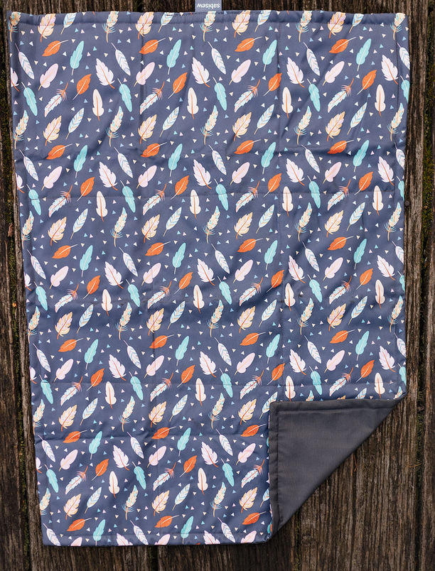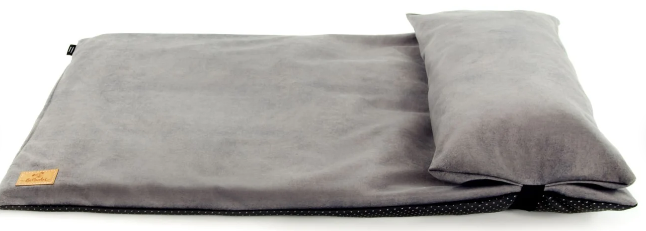 Padded dog travel blanket that can be rolled up and stored in a little water-resistsant pouch. Elastic bands hold the rolled up blanked together. Waterproof underside, carrying strap. Thin thermal fleece as the central layer.