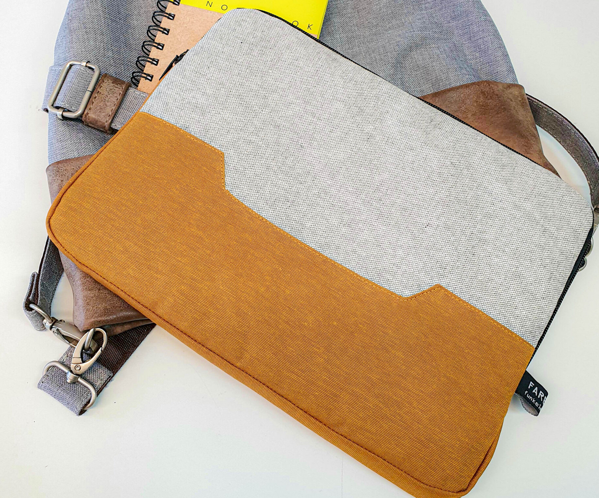 In dark copper cordoroy, linen or flexible canvas