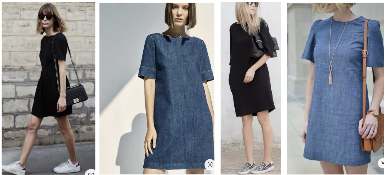 Simple dress in plain fabric, e.g. blue Chambrey. Pattern suggestion: Stevie tunic (Tilly & the buttons) Inari dress (Named Clothing, Sew DIY Box top (lengthen to be dress)